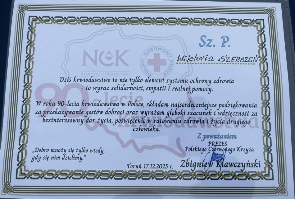 17.12.2025 r. na zaproszenie Polskiego Czerwonego Krzyża (PCK) oraz Marszałka Województwa Kujawsko-Pomorskiego Dyrektor Magdalena Niżnik wraz z Kadetami wzięła udział w podsumowaniu krwiodawstwa za rok 2025.